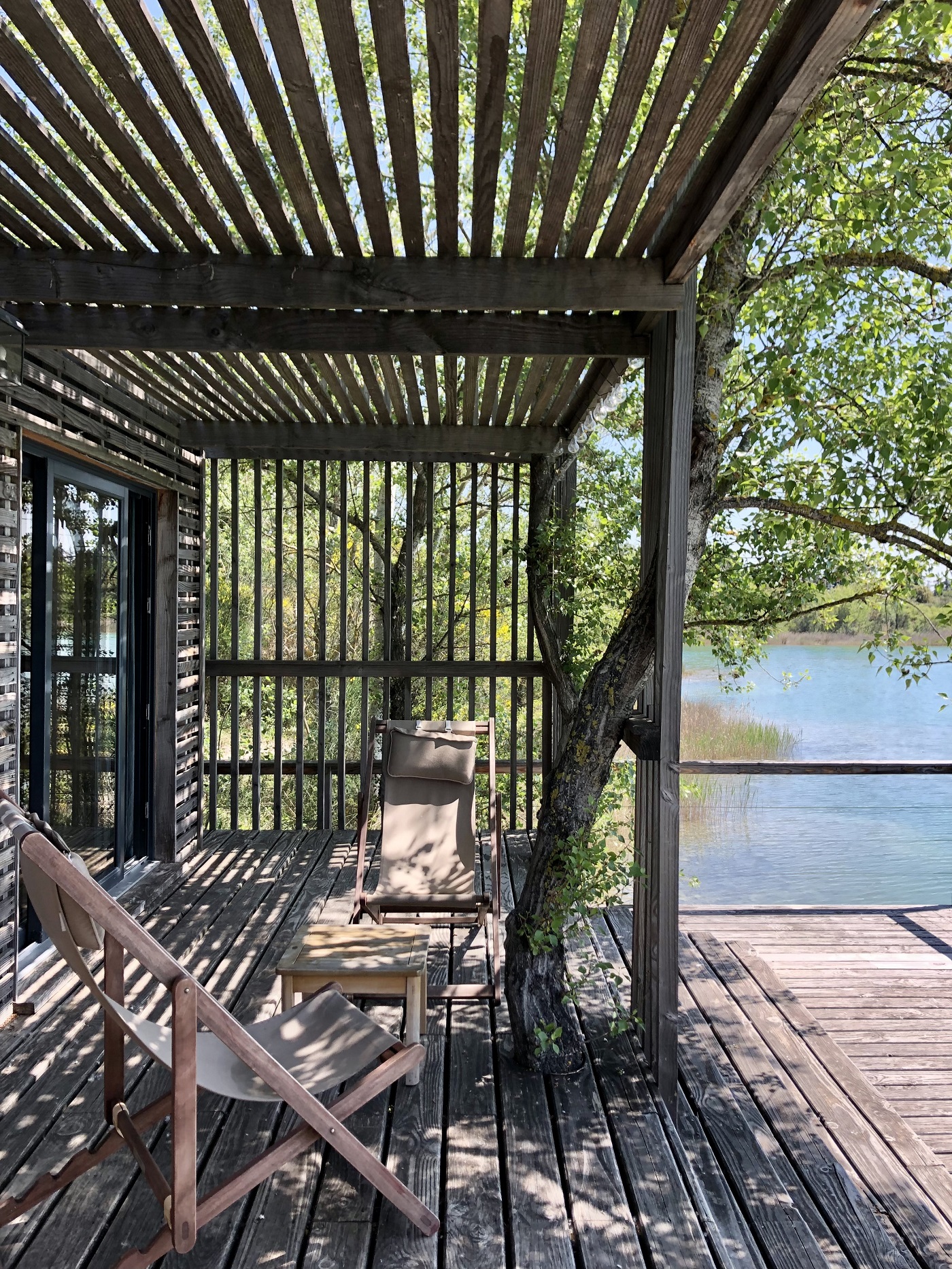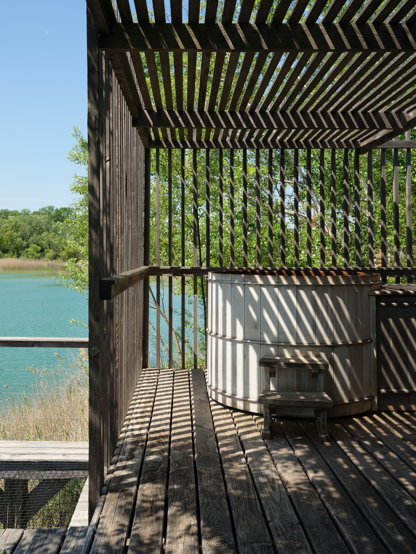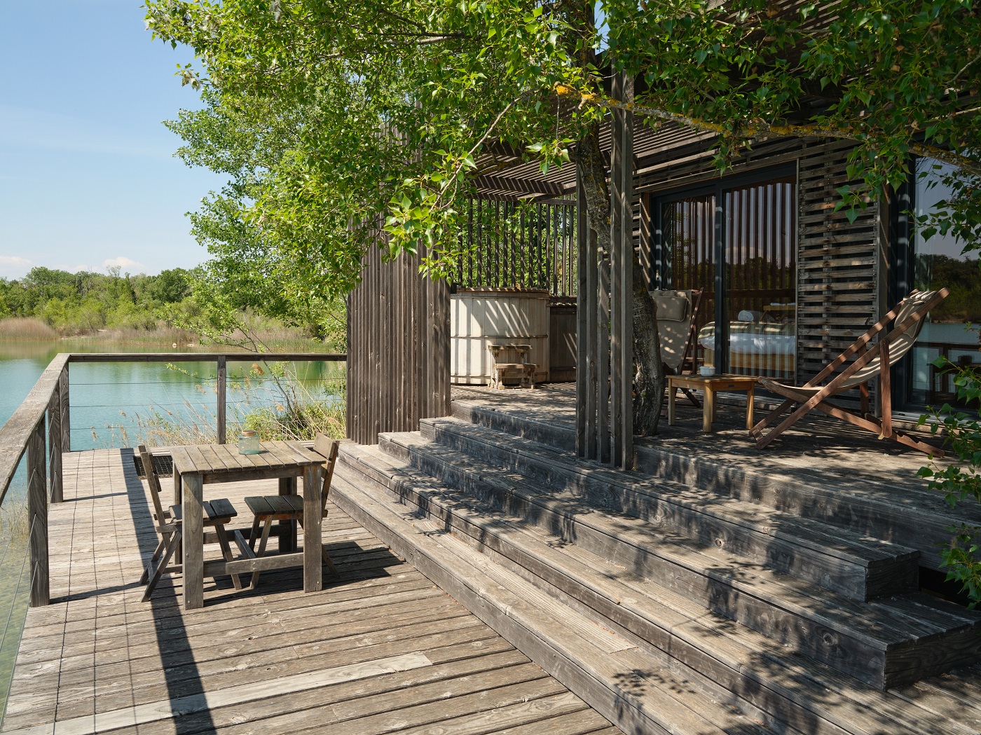 Sur la terrasse, un filet suspendu vous accueille pour un moment de repos ou de lecture au-dessus de l’eau. Un peu plus loin, votre bain nordique privatif chauffé proposé par Altipure est là pour vous apporter détente et relaxation. L’eau est traitée par la technologie Ultra Bio Ozone® sans produit chimique.